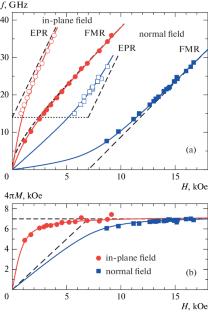 Films of metal-insulator nanogranular composites MxD100 –x with different composition and percentage of metal and dielectric phases (M = Fe, Co, CoFeB; D = Al2O3, SiO2, LiNbO3; x ≈ 15–70 at %) are investigated by magnetic resonance in a wide range of frequencies (f = 7–37 GHz) and temperatures (T = 4.2–360 K). In addition to the usual ferromagnetic resonance signal from an array of nanogranules, the experimental spectra contain an additional absorption peak, which we associate with the electron paramagnetic resonance (EPR) of Fe and Co ions dispersed in the insulating space between the granules. In contrast to the traditional EPR of Fe and Co ions in weakly doped non-magnetic matrices, the observed peak demonstrates a number of unusual properties, which we explain by the presence of magnetic interactions between ions and granules.