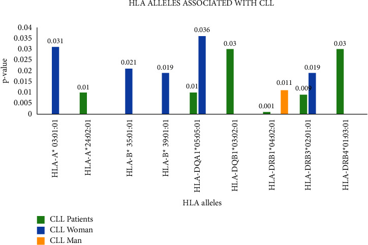 Results: Several HLA alleles were strongly associated with CLL. The most important finding was that HLA-DRB1∗04:02:01 (p=0.001, OR = 1.05) and HLA-DRB3∗02:01:01 (p=0.009, OR = 1.03) have a predisposing role in CLL development. Moreover, we identified that HLA-A∗24:02:01 0.01 (p=0.01, OR = 0.38), HLA-DQA1∗05:05:01 (p=0.01, OR = 0.56), HLA-DQB1∗03:02:01 (p=0.03, OR = 0.40), and HLA-DRB4∗01:03:01 (p=0.03, OR = 0.54 alleles have protective roles. Correlations between HLA expression and gender showed that women had a higher expression of protective HLA alleles when compared to men.