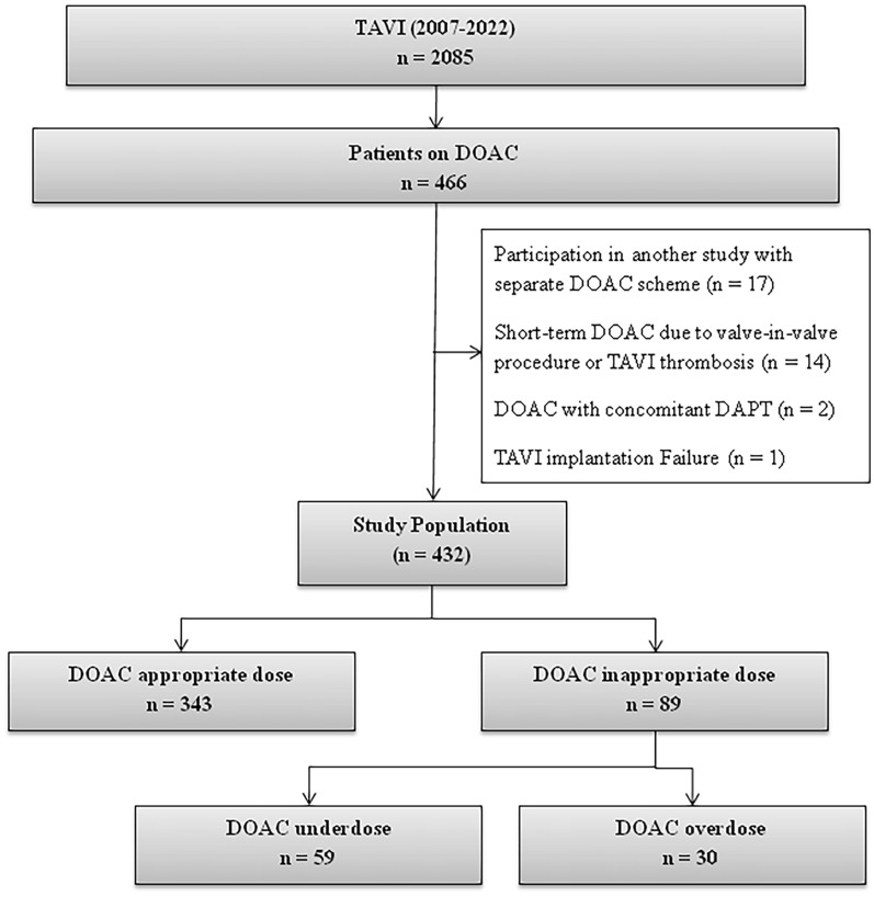 Methods: In a single-center study, 432 patients who were on long-term DOAC therapy and underwent TAVI between 2015 and 2022 were included. We analyzed the predictors and outcomes of inappropriate dosing of DOACs; namely apixaban, dabigatran, edoxaban, and rivaroxaban. A composite endpoint, including all-cause mortality, life-threatening/major bleeding, stroke, peripheral thromboembolic complications, or myocardial infarction, was assessed after 1 year.
