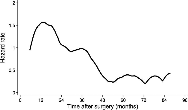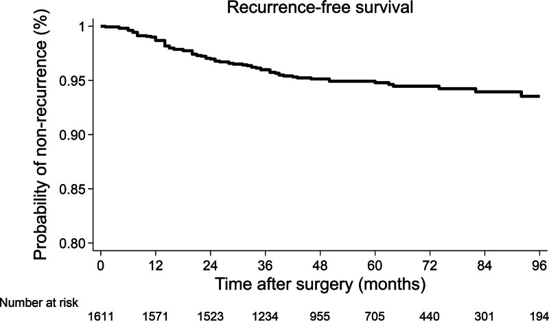 Results: Eighty patients developed cancer recurrence (5.0%), of which 90% was systemic relapse. The event was more frequent in pT2 (6.0% vs 3.2%, P = 0.013), male patients (6.1% vs 3.6%, P = 0.021), in the presence of lymphovascular invasion (7.2% vs 3.6%, P = 0.01), and in cases of partial resection (11.1% vs 4.6%, P = 0.011). Also, preoperative carcinoembryonic antigen (P = 0.007) and tumor diameter (P < 0.001) were higher in the group who relapsed. Most patients had isolated cancer recurrence (90%). Recurrences peaked between 10 and 18 months after surgery and declined over time. Adjusted Cox regression analysis identified tumor diameter, carcinoembryonic antigen level, lymphovascular invasion, male gender, and less than 12 analyzed lymph nodes as significant risk factors for worse recurrence-free survival.