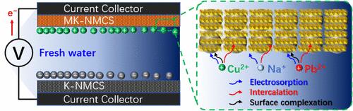 Integrating MnO2 with carbon is a reliable strategy to improve capacitive deionization (CDI) performance by leveraging the unique properties of both components (i.e., MnO2 and carbon). However, the influences of preliminary functionalization of carbon (e.g., nitrogen doping, KOH activation) and pairing of cathodes and anodes on the CDI performance have yet to be systematically explored. Herein, we prepared a group of MnO2-decorated mesoporous carbon composites with nitrogen as a dopant (i.e., MK-NMCS, K-NMCS, NMCS, and CS), and systematically evaluated the desalination performance of various cathode//anode pairs in a hybrid capacitive deionization (HCDI) for capturing Na+, Cu2+, and Pb2+, respectively. Of all electrodes, the MK-NMCS//K-NMCS pair demonstrates the optimum desalination performance based on salt adsorption capacity (SAC) and cycling stability, offering a SAC of 25.4 mg g–1 and a SAC retention of 102.4% after 50 consecutive charge–discharge cycles at 1.2 V in 500 ppm of NaCl solution. In addition, the MK-NMCS//K-NMCS electrodes also show the maximum ion adsorption capacity (IAC) toward Cu2+ and Pb2+ ions compared to other cathode//anode pairs, attaining an IAC of 37.0 and 30.0 mg Cu2+ per gram electrode materials at 1.2 V in 500 and 200 ppm of Cu2+ solutions, respectively (cf. 32.2 mg of Pb2+ per gram of electrode materials in 200 ppm of Pb2+ solution). Besides, these electrodes exhibit excellent cycling stability when applied in removing each heavy metal ion separately, with IAC retentions of 90.0 and 98.5% after 50 cycles toward Cu2+ and Pb2+ ions, respectively. Mechanical analysis reveals that both heavy metals are likely to be sequestered via capacitive electrosorption by carbon, intercalation with MnO2, and surface complexation at the external surface of the [MnO6] octahedral layers. Our results demonstrated a great potential of the MnO2-decorated N-doped carbon//prefunctionalized carbon pairs, in particular, the MK-NMCS//K-NMCS electrode pair for capturing heavy metal ions via HCDI platforms. Such prefunctionalization and pairing strategies are very promising for screening high-performance composite electrodes for wastewater remediation.