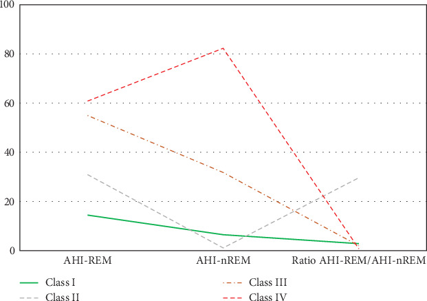在快速眼动(REM)和非快速眼动(NREM)睡眠期间发生的呼吸暂停低通气指数(AHI)比率(AHIREM/AHINREM比率)的临床应用一直存在争议。我们研究了快速眼动和非快速眼动睡眠行为的异质性,以确定未被观察到的睡眠呼吸障碍(SDB)的不同亚型,并检查其人口学和临床特征。本研究在沙特阿拉伯利雅得阿卜杜勒阿齐兹国王医疗城的睡眠障碍中心对3626名成年患者进行了多导睡眠图诊断评估。基于AHIREM、AHINREM和AHIREM/AHINREM比值进行潜在剖面分析,将被试划分为不同的SDB剖面。一个多项逻辑模型估计了SDB的优势比。四种不同的SDB亚型被确定为:I类(低AHIREM;75.9%)纳入REM睡眠期间SDB事件正常的患者作为参照组;II类(REM- osa, 1.2%)包括快速眼动睡眠期间AHI高,非快速眼动睡眠期间AHI最低的患者,导致AHIREM/AHINREM比例最大;III类(AHINREM < 30事件/小时,17.4%);IV级(AHINREM≥30次/小时,5.5%)。与I类患者相比,IV类患者的相关因素包括年龄较大、BMI高、颈围大、高血压、总睡眠时间减少、REM睡眠时间减少、睡眠效率差、去饱和指数高、SpO2低、觉醒指数高、Epworth嗜睡量表高。正如假设的那样,该研究在一个大型队列中根据AHIREM、AHINREM及其比率(AHIREM/AHINREM)表征了SDB的几种亚型,并确定了它们的人口学和临床特征。这些亚型可能在临床上对睡眠诊所的成年患者的SDB定义有用,这些患者可能根据其疾病的亚型对治疗有不同的反应。