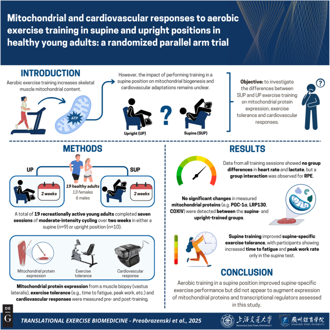 Conclusions: Our exploratory analyses showed that supine aerobic training more effectively improves supine exercise tolerance and performance compared with upright training, despite no differences in measured proteins related to mitochondrial biogenesis. Further research is needed to elucidate the mechanisms underlying these postural-specific training effects.