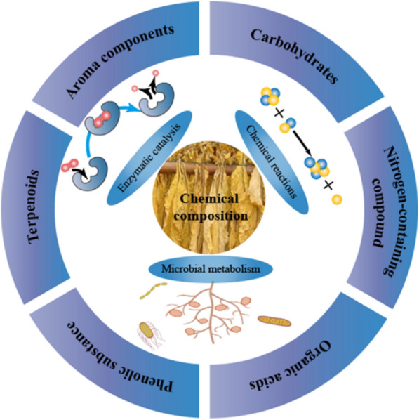The aging is a crucial stage in tobacco processing, which contributes to the reduction of impurities and irritation, and the stabilization of the internal chemical composition of the leaves. However, it usually takes a long time (2-3 years) for the nature aging process of tobacco (20 °C-30 °C, relative humidity of 65-75%), which seriously affects the processing efficiency of tobacco. Microorganisms play an important role in the change of chemical composition and characteristic aromatic substances of tobacco. Acinetobacter, Sphingomonas Aspergillus, Bacilli, and Pseudonocardia is the main microorganism in the aging process of tobacco, which increasing the aromatic substances (such as alcohols, ketones, and esters) by the action of the enzymes and metabolites, and degrade the harmful components (such as alkaloid, nicotine and nitrosamines in tobacco). This review systematically summarizes recent advancements in understanding the primary microbial composition and the changes in chemical composition during tobacco aging. This knowledge is helpful for screening functional strains, and control the process of tobacco aging by the inoculation of these strains.