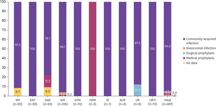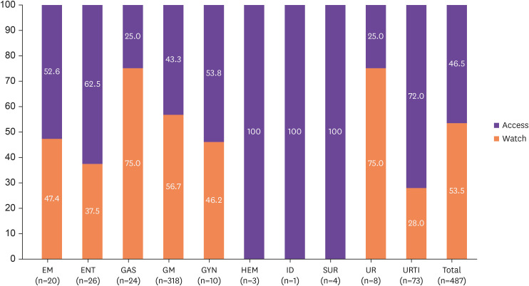 Results: A total of 5,084 outpatients from 149 units were surveyed, of which 487 (9.6%) received at least one antimicrobial agent. The highest rates of antimicrobial prescribing were observed at upper respiratory tract (33.2%), gastroenterology (22.6%), hematology (13.6%), ear nose and throat (13.5%), and gynecology units (11.6%). Antibacterials accounted for 63.4% of antimicrobials on average, followed by antivirals (35.4%). Penicillins (41.4%), for the most part penicillin/beta-lactamase inhibitor combinations (30.1%), cephalosporins (18.3%), including third generation (17.7%), fluoroquinolones (16.1%), and macrolides (11.5%) were the top classes of antibiotics prescribed. Umifenovir (23.8%) and amoxicillin/clavulanic acid (19.0%) were the top antimicrobials prescribed. The administered antibacterials were almost equally distributed between "access" (46.5%) and "watch" (53.5%) AWaRe groups. On average, choice of antimicrobials followed the national guidelines issued by the Ministry of Health in 73.2% of cases.