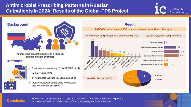 Materials and methods: A point prevalence study was conducted during January-April 2024 in 14 healthcare facilities in 11 Russian cities (Chelyabinsk, Ekaterinburg, Krasnoyarsk, Moscow, Novokuznetsk, Saratov, Smolensk, Ulan-Ude, Vladivostok, Yakutsk, and Yaroslavl) in accordance with the outpatient protocol of Global-PPS project. Detailed data on antimicrobials, age, gender, and drug indications were collected for each outpatient receiving at least one agent for prophylaxis or treatment.