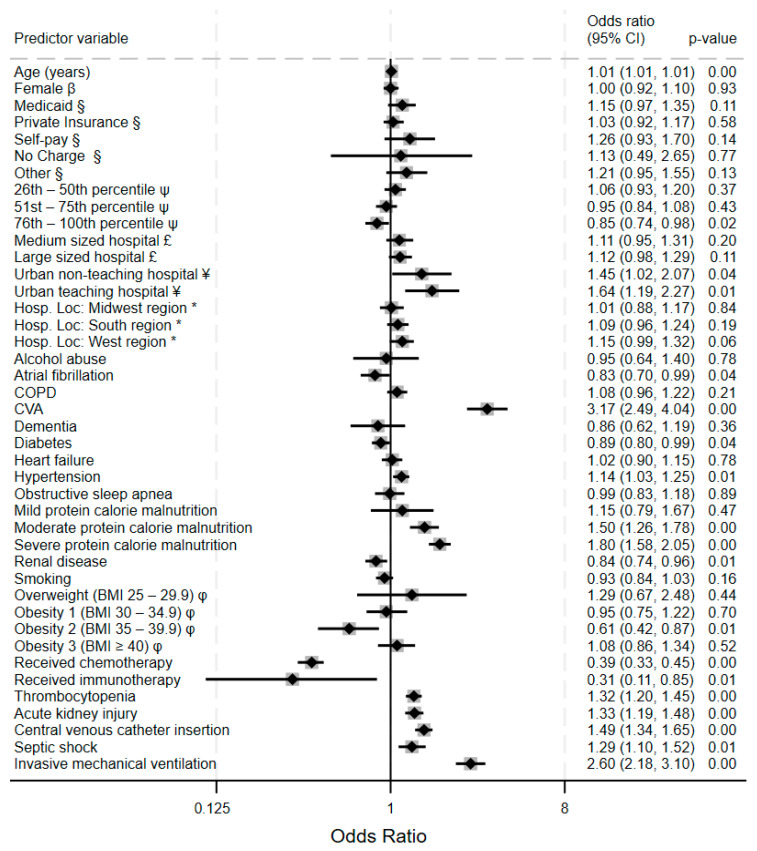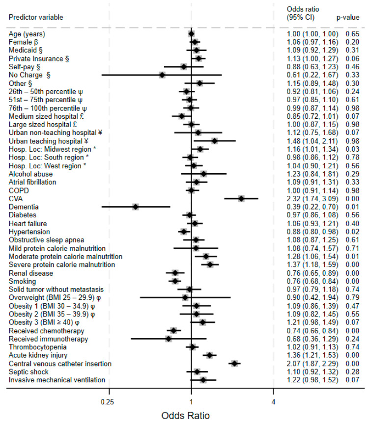{"title":"Trends and Predictors of Venous Thromboembolism and Major Hemorrhagic Events in Hospitalized Leukemia Patients: A Cross-Sectional Analysis of the NIS (2016-2020).","authors":"Daniel Antwi-Amoabeng, Bryce D Beutler, Vijay Neelam, Mark Ulanja","doi":"10.3390/clinpract15070117","DOIUrl":null,"url":null,"abstract":"<p><strong>Background/objectives: </strong>Venous thromboembolism (VTE) and major hemorrhagic events are significant complications in hospitalized leukemia patients, but contemporary analyses of their epidemiology, predictors, and impact on clinical outcomes remain limited.</p><p><strong>Methods: </strong>We conducted a cross-sectional study using the National Inpatient Sample (NIS) database from 2016 to 2020. Hospitalized leukemia patients were identified using ICD-10 codes. Trends in the incidence of venous thromboembolism (VTE) and bleeding were assessed across the years, and multivariable logistic regression models were used to evaluate the predictors of VTE and bleeding. We assessed the influence thromboembolic and hemorrhagic complications on length of stay, cost, and mortality outcomes.</p><p><strong>Results: </strong>Among 430,780 leukemia hospitalizations, the overall incidence of VTE was 5.4% and remained stable throughout the study period (<i>p</i> = 0.09), while hemorrhagic events = 5.6%) showed a significant upward trend (<i>p</i> = 0.01). Cerebrovascular accidents, central venous catheter insertion, and protein calorie malnutrition (PCM) were significant predictors of both VTE and hemorrhage. PCM demonstrated a dose-dependent relationship with both complications. VTE was associated with a 33.5% increase in length of stay (LOS) and a 35% increase in cost of care (COC). Hemorrhage was associated with 23.2% increase in LOS and 32.6% increase in COC. Only hemorrhagic events were independently associated with increased mortality (adjusted OR 2.88, <i>p</i> < 0.001).</p><p><strong>Conclusions: </strong>The incidence of VTE in hospitalized leukemia patients has remained stable while hemorrhagic complications have increased significantly. Nutritional status represents a potentially modifiable risk factor for both VTE and bleeding complications. The competing risk between thrombosis and hemorrhage varies with age and nutritional status, suggesting the need for nuanced thromboprophylaxis strategies in this vulnerable population.</p>","PeriodicalId":45306,"journal":{"name":"Clinics and Practice","volume":"15 7","pages":""},"PeriodicalIF":2.2000,"publicationDate":"2025-06-25","publicationTypes":"Journal Article","fieldsOfStudy":null,"isOpenAccess":false,"openAccessPdf":"https://www.ncbi.nlm.nih.gov/pmc/articles/PMC12293792/pdf/","citationCount":"0","resultStr":null,"platform":"Semanticscholar","paperid":null,"PeriodicalName":"Clinics and Practice","FirstCategoryId":"1085","ListUrlMain":"https://doi.org/10.3390/clinpract15070117","RegionNum":0,"RegionCategory":null,"ArticlePicture":[],"TitleCN":null,"AbstractTextCN":null,"PMCID":null,"EPubDate":"","PubModel":"","JCR":"Q2","JCRName":"MEDICINE, GENERAL & INTERNAL","Score":null,"Total":0}