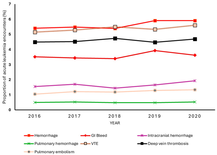 Methods: We conducted a cross-sectional study using the National Inpatient Sample (NIS) database from 2016 to 2020. Hospitalized leukemia patients were identified using ICD-10 codes. Trends in the incidence of venous thromboembolism (VTE) and bleeding were assessed across the years, and multivariable logistic regression models were used to evaluate the predictors of VTE and bleeding. We assessed the influence thromboembolic and hemorrhagic complications on length of stay, cost, and mortality outcomes.