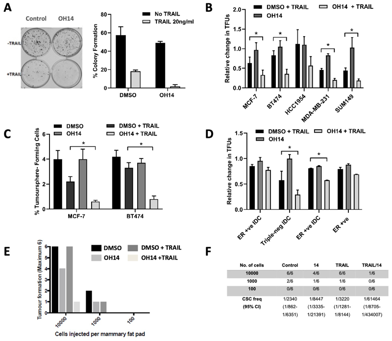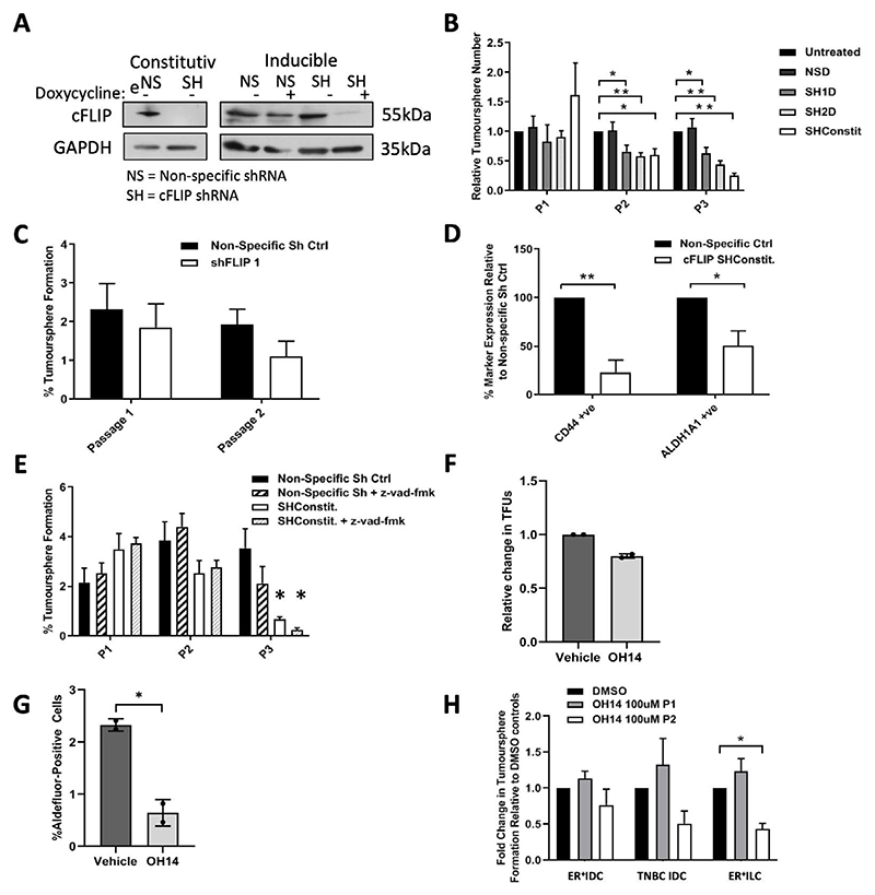 Therapeutic targeting of tumour initiating, cancer stem cells (CSCs), offers the potential to improve long-term responses to cancer treatments. The apoptosis related protein Cellular FLICE-Like Inhibitory Protein (cFLIP) has previously been reported to protect breast cancer cells and breast CSCs from the cytotoxic effects of chemotherapy and apoptosis-inducing agents. We recently described the development of a small-molecule protein-protein inhibitor of cFLIP (OH14) that sensitizes refractory breast cancer cells to the death-receptor agonist Tumour Necrosis Factor Alpha Receptor Apoptosis Inducing Ligand (TRAIL). Here we investigated whether the pharmacological inhibition of cFLIP also targeted breast CSCs. Human breast cancer cell lines and primary-derived breast cancer samples were subjected to OH14 with or without TRAIL and assessed for bCSC viability by colony-formation and tumoursphere assay in vitro and xenograft tumour initiation in vivo. OH14 potentiated a reduction in the number of bCSCs after TRAIL treatment, mimicking the sensitizing effects previously observed with epigenetic silencing of cFLIP. Moreover, prolonged inhibition of cFLIP alone, either by shRNA knockdown or treatment with OH14, reduced the bCSC pool, an outcome that was independent of caspases. These data provide proof-of-principle for the use of pharmacological inhibitors of cFLIP to target bCSCs and highlights for the first time both apoptosis-dependent and independent mechanisms for cFLIP-mediated regulation of the breast cancer stem cell pool.