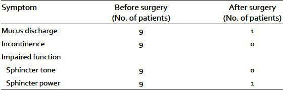 Results: Nine multiparous women aged between 52 and 70 years had the procedure. The mean operative time was 135 minutes (range 110-220). The follow-up period was between 29 months and 7 years. Full continence was restored in all patients within eight weeks of the operation. Bowel habit returned to once daily in four patients and once every other day in the remaining five patients, within thirteen weeks of surgery. One patient had intermittent mucus discharge per rectum for six months. This stopped without a specific treatment. There has been no known recurrence in these nine patients. One patient developed wound infection as a complication. There was no mortality. All the patients are now asymptomatic.