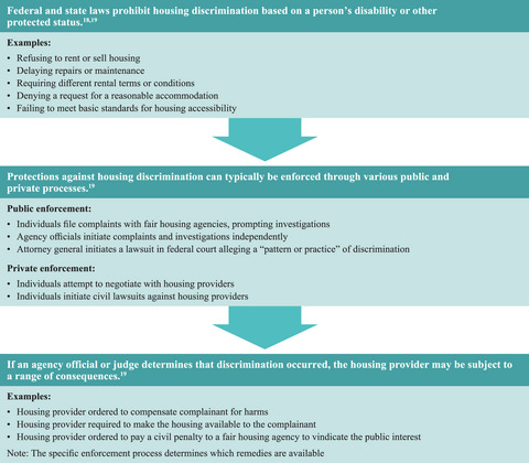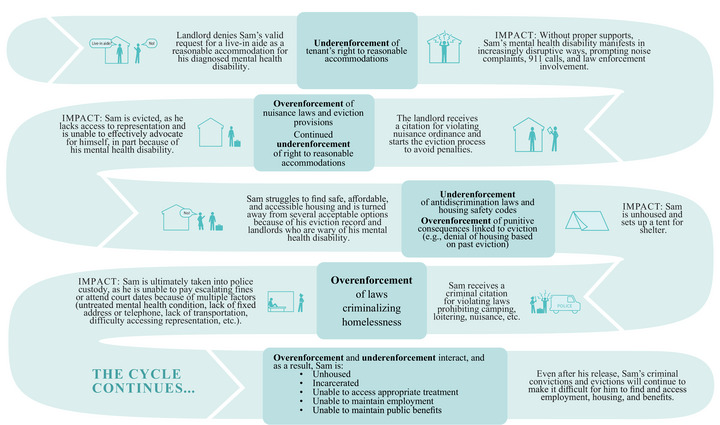 Policy Points People with disabilities experience a vicious cycle of poverty, poor health, and marginalization partly because of the inequitable implementation and enforcement of laws, including underenforcement of civil rights and housing laws and overenforcement of punitive nuisance and criminal laws. Inequitable enforcement reflects policy choices that prioritize powerful entities (e.g., landlords, developers) to the detriment of people who experience intersectional structural discrimination based on, for example, race, disability, and income. Equitable enforcement, a process of ensuring compliance with the law while considering and minimizing harms to marginalized people, can promote health and disability justice by increasing access to safe, stable, and accessible housing.