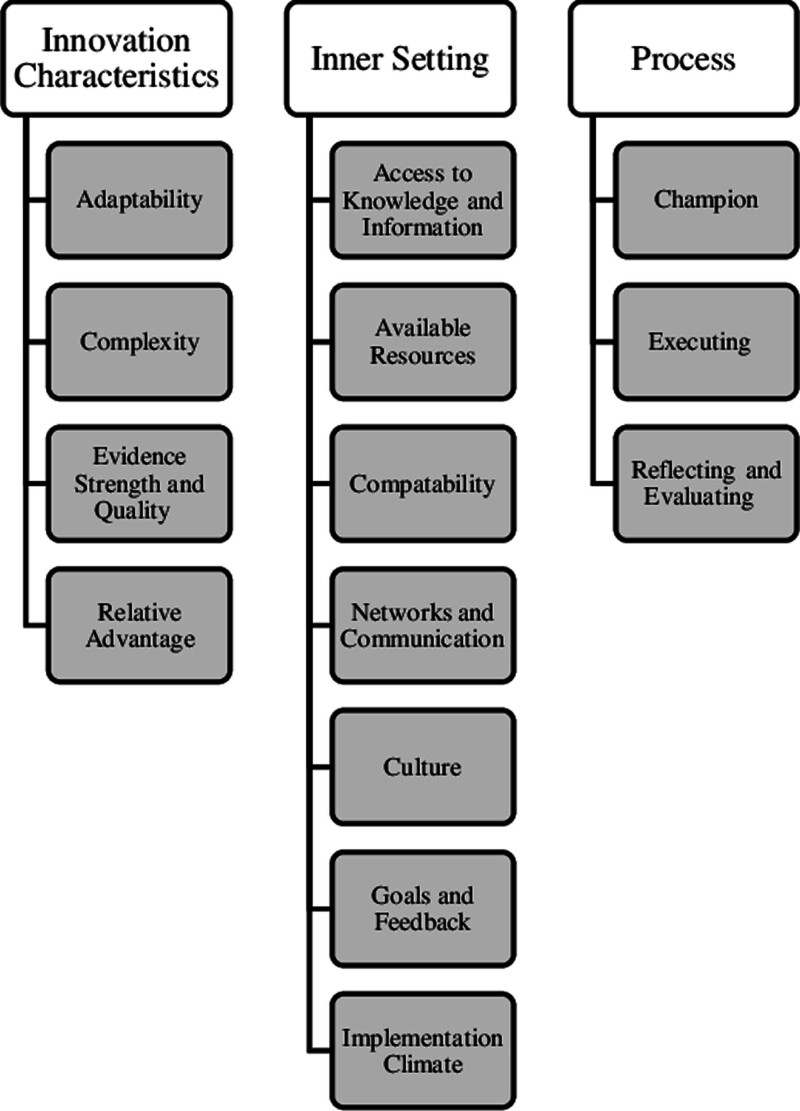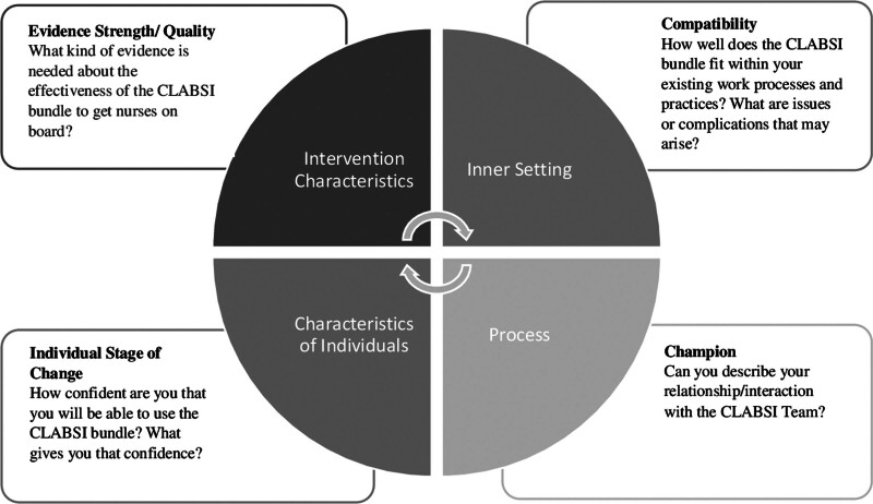 Conclusions: Implementation Science Frameworks, such as Consolidated Framework for Implementation Research (CFIR), can be a beneficial framework to guide quality improvement efforts for evidence-based practices such as the CLABSI bundle. Using a champion role in the critical care setting may be an important implementation strategy for CLABSI bundle adoption and sustainment efforts.