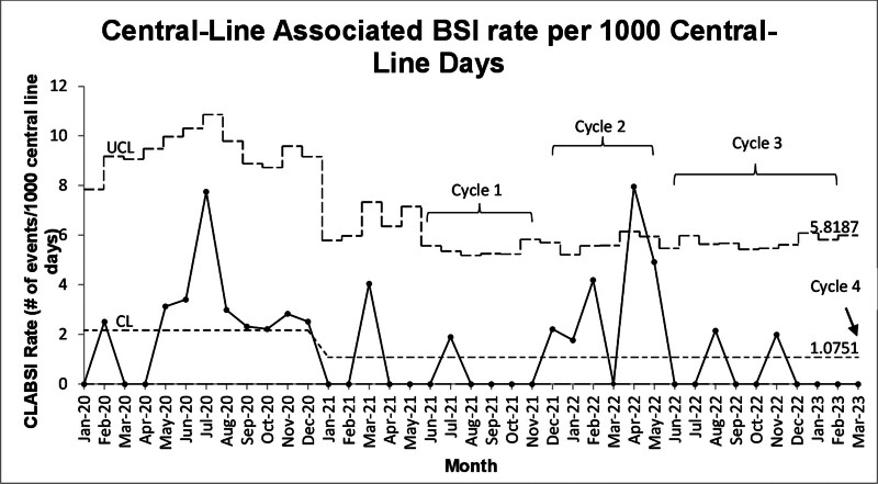 Results: Facilitators and barriers for the CLABSI bundle occurred in four domains: inner setting, process, characteristics of individuals, and innovation characteristics in each cycle that led to recommended implementation strategy opportunities. The champion role was a major implementation strategy that facilitated the adoption and sustainment of the CLABSI bundle.