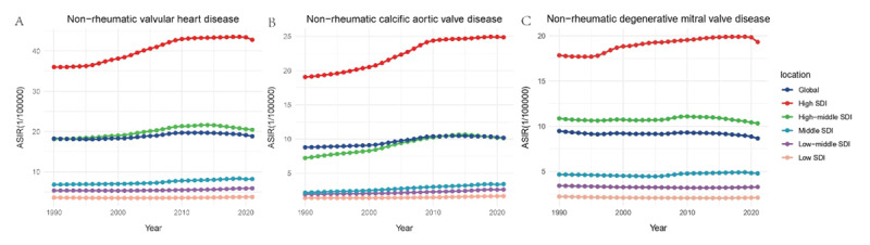 Conclusions: With economic development and population aging, female NRVHD remains a significant healthcare burden for countries worldwide. Low- and middle-SDI regions should implement tertiary prevention strategies to address the impending shift in the spectrum of valvular heart diseases. Further clinical research should focus on female patients as a distinct subgroup of NRVHD, exploring the unique aspects of the disease in this population.