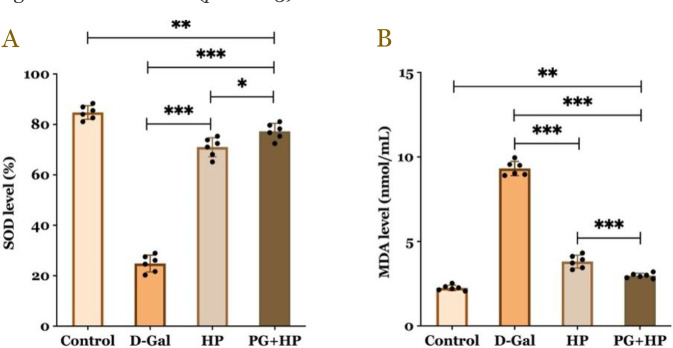 {"title":"葡甘露聚糖联合高蛋白饮食对d -半乳糖诱导大鼠氧化应激、炎症和衰老标志物的影响。","authors":"Azizah H Safitri, Rahmata A Sayyida, Sigit Setyawan, Nurina Tyagita","doi":"10.52225/narra.v5i1.1995","DOIUrl":null,"url":null,"abstract":"<p><p>Aging is a predominant risk factor for several diseases associated with reduced life expectancy. To address this risk factor, several studies have proposed the combined use of porang glucomannan and a high-protein diet to improve various aging markers. The aim of this study was to determine the effects of porang glucomannan and high-protein combination diet as an anti-aging agent. An experimental study using a post-test-only control group design was conducted using Sprague Dawley white rats. The animals were randomly divided into four groups with different treatments: normal control, D-galactose, high-protein diet, and a combination of porang glucomannan and high-protein combination diet. Blood samples were then collected from the ophthalmic vein on day 58 for biomarker measurement using the enzyme-linked immunosorbent assay (ELISA) method. The parameters measured were superoxide dismutase (SOD), malondialdehyde (MDA), interleukin (IL)-6, tumor necrosis factor-alpha (TNF-α), insulin growth factor-1 (IGF-1), NOD-like receptor family pyrin domain-containing protein 3 (NLRP3), growth differentiation factor-11 (GDF11), and α-Klotho levels. The results showed that the combination of porang glucomannan and high-protein diet could improve oxidative stress, inflammation, and aging markers. The analysis of variance (ANOVA) test followed by post-hoc showed significant differences between the combination diet and high protein group (<i>p</i> < 0.001). In addition, the average levels of oxidative stress markers (SOD and MDA) in porang glucomannan and high-protein combination group were improved significantly. Similar results were also obtained for inflammatory markers (IL-6 and TNF-α) and aging markers (NLRP3, IGF-1, GDF-11, and α-Klotho). The mean NRLP-3 levels in glucomannan and high-protein combination group were not significantly different compared to control. The study highlights that the combination of porang glucomannan and a high-protein diet effectively improved various aging markers.</p>","PeriodicalId":517416,"journal":{"name":"Narra J","volume":"5 1","pages":"e1995"},"PeriodicalIF":0.0000,"publicationDate":"2025-04-01","publicationTypes":"Journal Article","fieldsOfStudy":null,"isOpenAccess":false,"openAccessPdf":"https://www.ncbi.nlm.nih.gov/pmc/articles/PMC12059859/pdf/","citationCount":"0","resultStr":"{\"title\":\"Effects of porang glucomannan combined with a high-protein diet on oxidative stress, inflammation, and aging markers in D-galactose-induced rats.\",\"authors\":\"Azizah H Safitri, Rahmata A Sayyida, Sigit Setyawan, Nurina Tyagita\",\"doi\":\"10.52225/narra.v5i1.1995\",\"DOIUrl\":null,\"url\":null,\"abstract\":\"<p><p>Aging is a predominant risk factor for several diseases associated with reduced life expectancy. To address this risk factor, several studies have proposed the combined use of porang glucomannan and a high-protein diet to improve various aging markers. The aim of this study was to determine the effects of porang glucomannan and high-protein combination diet as an anti-aging agent. An experimental study using a post-test-only control group design was conducted using Sprague Dawley white rats. The animals were randomly divided into four groups with different treatments: normal control, D-galactose, high-protein diet, and a combination of porang glucomannan and high-protein combination diet. Blood samples were then collected from the ophthalmic vein on day 58 for biomarker measurement using the enzyme-linked immunosorbent assay (ELISA) method. The parameters measured were superoxide dismutase (SOD), malondialdehyde (MDA), interleukin (IL)-6, tumor necrosis factor-alpha (TNF-α), insulin growth factor-1 (IGF-1), NOD-like receptor family pyrin domain-containing protein 3 (NLRP3), growth differentiation factor-11 (GDF11), and α-Klotho levels. The results showed that the combination of porang glucomannan and high-protein diet could improve oxidative stress, inflammation, and aging markers. The analysis of variance (ANOVA) test followed by post-hoc showed significant differences between the combination diet and high protein group (<i>p</i> < 0.001). In addition, the average levels of oxidative stress markers (SOD and MDA) in porang glucomannan and high-protein combination group were improved significantly. Similar results were also obtained for inflammatory markers (IL-6 and TNF-α) and aging markers (NLRP3, IGF-1, GDF-11, and α-Klotho). The mean NRLP-3 levels in glucomannan and high-protein combination group were not significantly different compared to control. The study highlights that the combination of porang glucomannan and a high-protein diet effectively improved various aging markers.</p>\",\"PeriodicalId\":517416,\"journal\":{\"name\":\"Narra J\",\"volume\":\"5 1\",\"pages\":\"e1995\"},\"PeriodicalIF\":0.0000,\"publicationDate\":\"2025-04-01\",\"publicationTypes\":\"Journal Article\",\"fieldsOfStudy\":null,\"isOpenAccess\":false,\"openAccessPdf\":\"https://www.ncbi.nlm.nih.gov/pmc/articles/PMC12059859/pdf/\",\"citationCount\":\"0\",\"resultStr\":null,\"platform\":\"Semanticscholar\",\"paperid\":null,\"PeriodicalName\":\"Narra J\",\"FirstCategoryId\":\"1085\",\"ListUrlMain\":\"https://doi.org/10.52225/narra.v5i1.1995\",\"RegionNum\":0,\"RegionCategory\":null,\"ArticlePicture\":[],\"TitleCN\":null,\"AbstractTextCN\":null,\"PMCID\":null,\"EPubDate\":\"2025/2/13 0:00:00\",\"PubModel\":\"Epub\",\"JCR\":\"\",\"JCRName\":\"\",\"Score\":null,\"Total\":0}","platform":"Semanticscholar","paperid":null,"PeriodicalName":"Narra J","FirstCategoryId":"1085","ListUrlMain":"https://doi.org/10.52225/narra.v5i1.1995","RegionNum":0,"RegionCategory":null,"ArticlePicture":[],"TitleCN":null,"AbstractTex