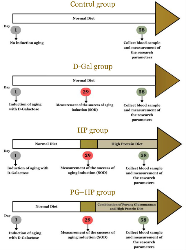Aging is a predominant risk factor for several diseases associated with reduced life expectancy. To address this risk factor, several studies have proposed the combined use of porang glucomannan and a high-protein diet to improve various aging markers. The aim of this study was to determine the effects of porang glucomannan and high-protein combination diet as an anti-aging agent. An experimental study using a post-test-only control group design was conducted using Sprague Dawley white rats. The animals were randomly divided into four groups with different treatments: normal control, D-galactose, high-protein diet, and a combination of porang glucomannan and high-protein combination diet. Blood samples were then collected from the ophthalmic vein on day 58 for biomarker measurement using the enzyme-linked immunosorbent assay (ELISA) method. The parameters measured were superoxide dismutase (SOD), malondialdehyde (MDA), interleukin (IL)-6, tumor necrosis factor-alpha (TNF-α), insulin growth factor-1 (IGF-1), NOD-like receptor family pyrin domain-containing protein 3 (NLRP3), growth differentiation factor-11 (GDF11), and α-Klotho levels. The results showed that the combination of porang glucomannan and high-protein diet could improve oxidative stress, inflammation, and aging markers. The analysis of variance (ANOVA) test followed by post-hoc showed significant differences between the combination diet and high protein group (p < 0.001). In addition, the average levels of oxidative stress markers (SOD and MDA) in porang glucomannan and high-protein combination group were improved significantly. Similar results were also obtained for inflammatory markers (IL-6 and TNF-α) and aging markers (NLRP3, IGF-1, GDF-11, and α-Klotho). The mean NRLP-3 levels in glucomannan and high-protein combination group were not significantly different compared to control. The study highlights that the combination of porang glucomannan and a high-protein diet effectively improved various aging markers.