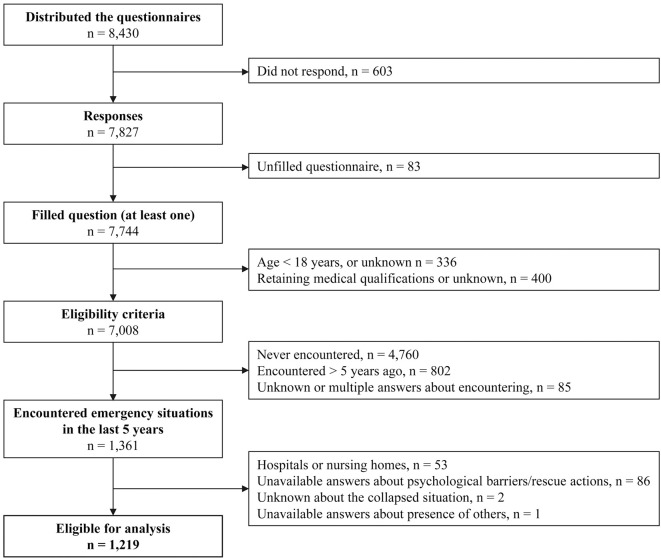 Methods and results: A cross-sectional study was performed using data from an anonymous self-administered questionnaire-based survey that included laypersons who had encountered emergency situations during the past 5 years. Based on their responses related to the presence of other people, laypersons were divided into 2 groups: "single-bystander" (absence of others) and "multiple-bystanders" (presence of others). The primary outcome was any rescue action(s) performed by laypersons during an emergency. A total of 1,219 laypersons were eligible for our analysis; 69 (5.7%) encountered emergencies in which others were absent (single-bystander group) and 1,150 (94.3%) encountered emergencies in which others were present (multiple-bystanders group). The proportion of laypersons who performed any rescue actions was 95.7% in the single-bystander group and 73.8% in the multiple-bystanders group.