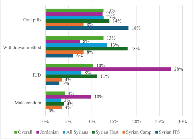 Results: The survey found that 63.4% of Jordanian youth and 42.8% of Syrian refugee youth were recently using contraception, with notable differences in type of contraceptive method used by both refugee status and residence. Among Syrian refugee youth, living in a host community emerged as a key factor associated with contraceptive use, as it was associated with a 19.6 percentage point increase in the likelihood of using contraception compared to those living in refugee camps. Qualitative themes nuance these findings, suggesting that living in a refugee camp where there is more restricted access to healthcare services, more salient social norms, and limited knowledge about reproductive health present barriers to contraceptive use for Syrian refugee youth.