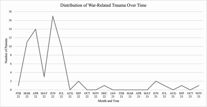 Results: War-related injuries, including blast and shelling, accounted for 26% of all cases. Temporal analysis showed two peaks in injury incidence correlating with significant military events in the region. Analysis of the war-related injuries indicated that the most affected body regions included the upper extremities (31%), lower extremities (28%), and thorax (28%). The median ISS was 9, with over one-third (36%) of patients sustaining severe or critical injuries. Outcomes at discharge revealed a majority, 52%, achieved good recovery, followed by 41% with moderate disabilities. A smaller percentage (3%) faced severe disabilities, while 5% of the cases resulted in fatalities.